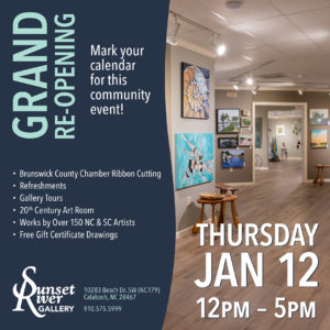 We have been busy at the gallery with new flooring, new paint, and even a few new walls. This week new signage is being installed out front. To celebrate our new look and our continued presence as a vibrant local & regional art gallery, we're partnering with the Brunswick County Chamber of Commerce for a … Continue reading Grand Re-Opening & Ribbon Cutting